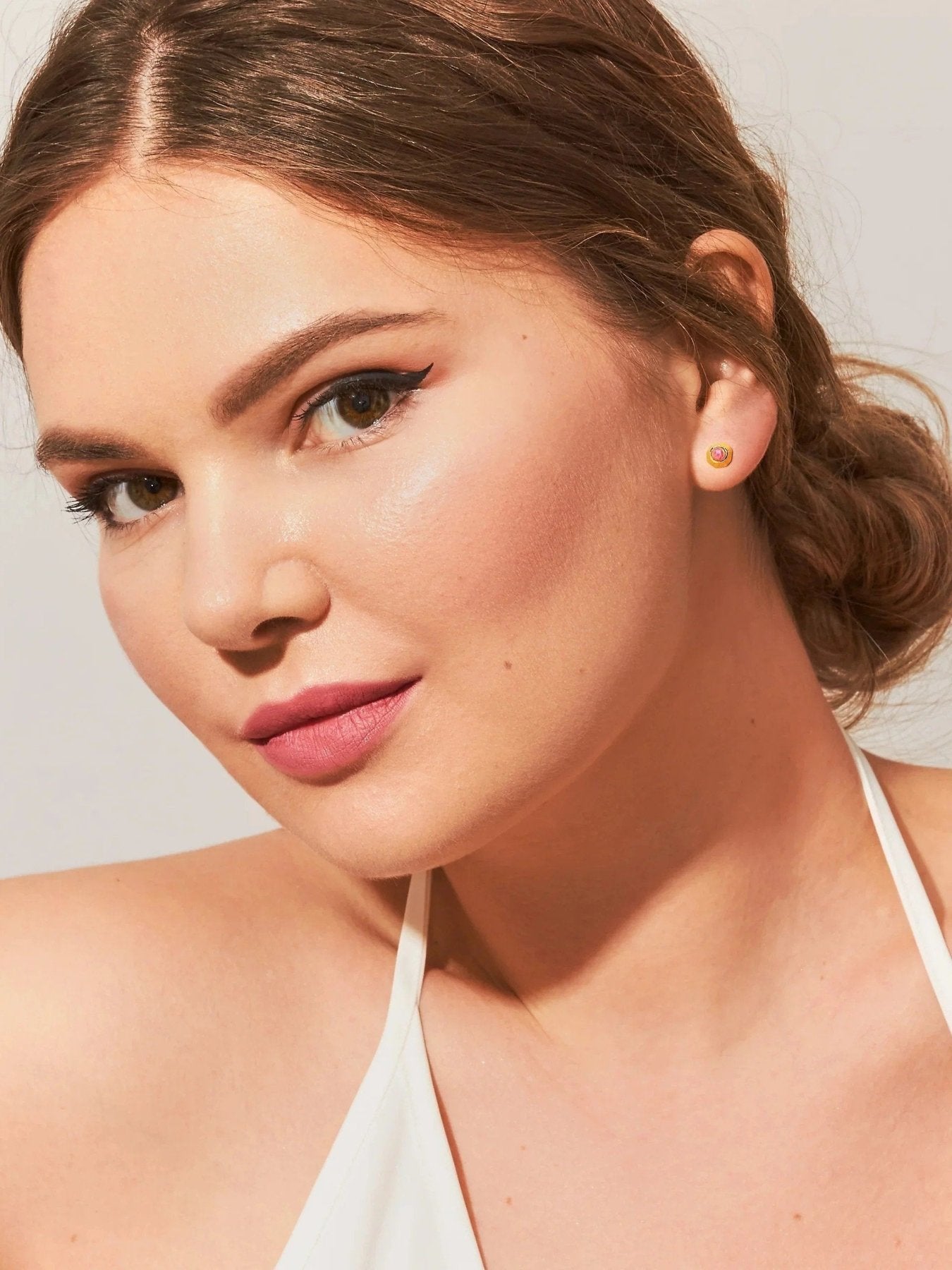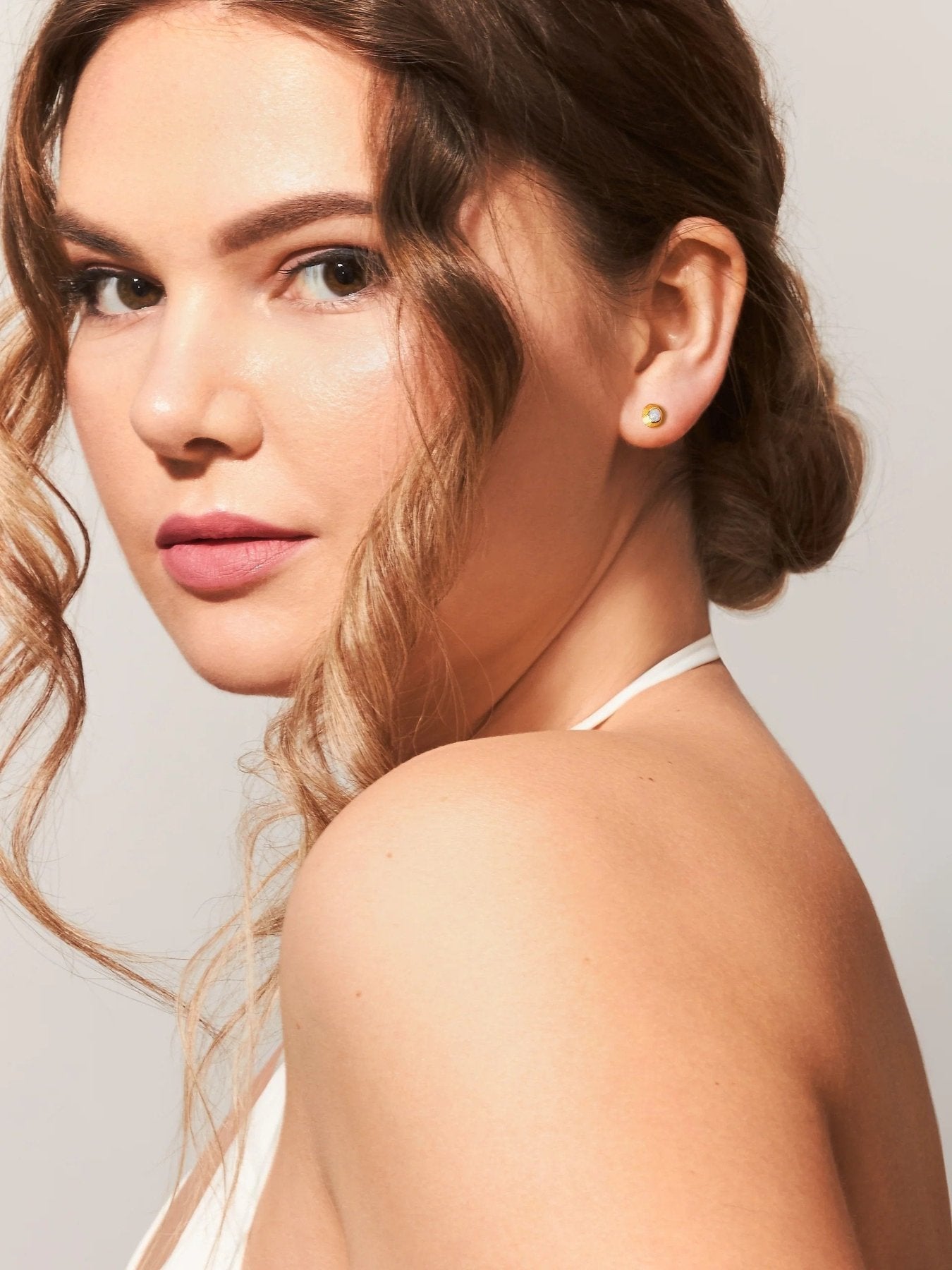 Close-up of model wearing gold stud earrings with natural gemstones.